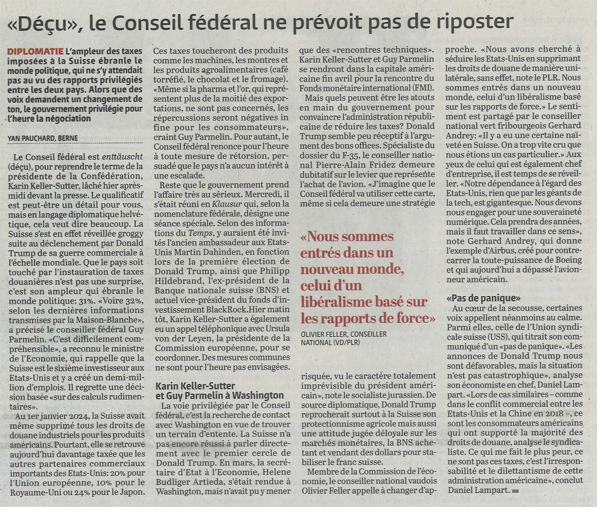 "Déçu", le Conseil fédéral ne prévoit pas de riposter Le Temps, 4 avril 2025 [ Agrandir l'article ] |