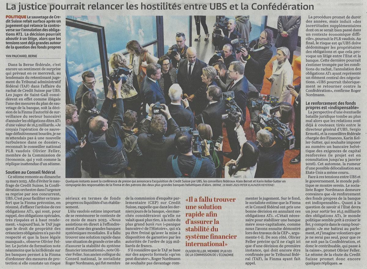 La justice pourrait relancer les hostilités entre UBS et la Confédération Le Temps, 16 octobre 2025 [ Agrandir l'article ] |