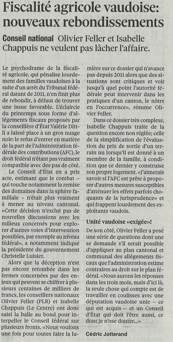 Fiscalité agricole vaudoise: nouveaux rebondissements 24 heures, 21 juin 2025 [ Agrandir l'article ] |