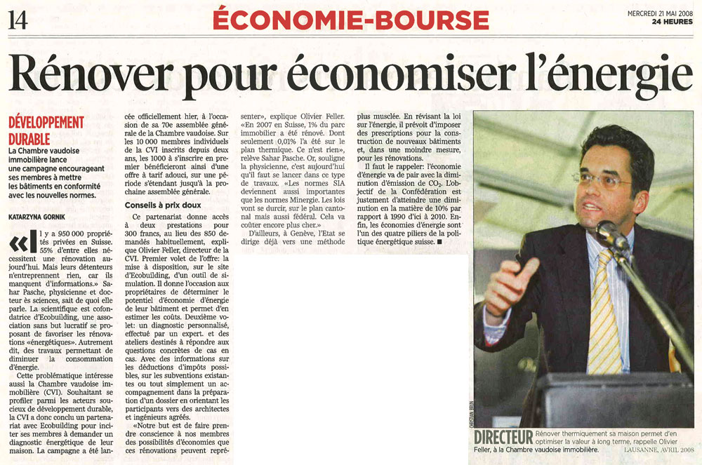 Les économies d'énergie: une préoccupation d'actualité pour la Chambre vaudoise immobilière La Côte, 29 mai 2008 [ Agrandir l'article ] |